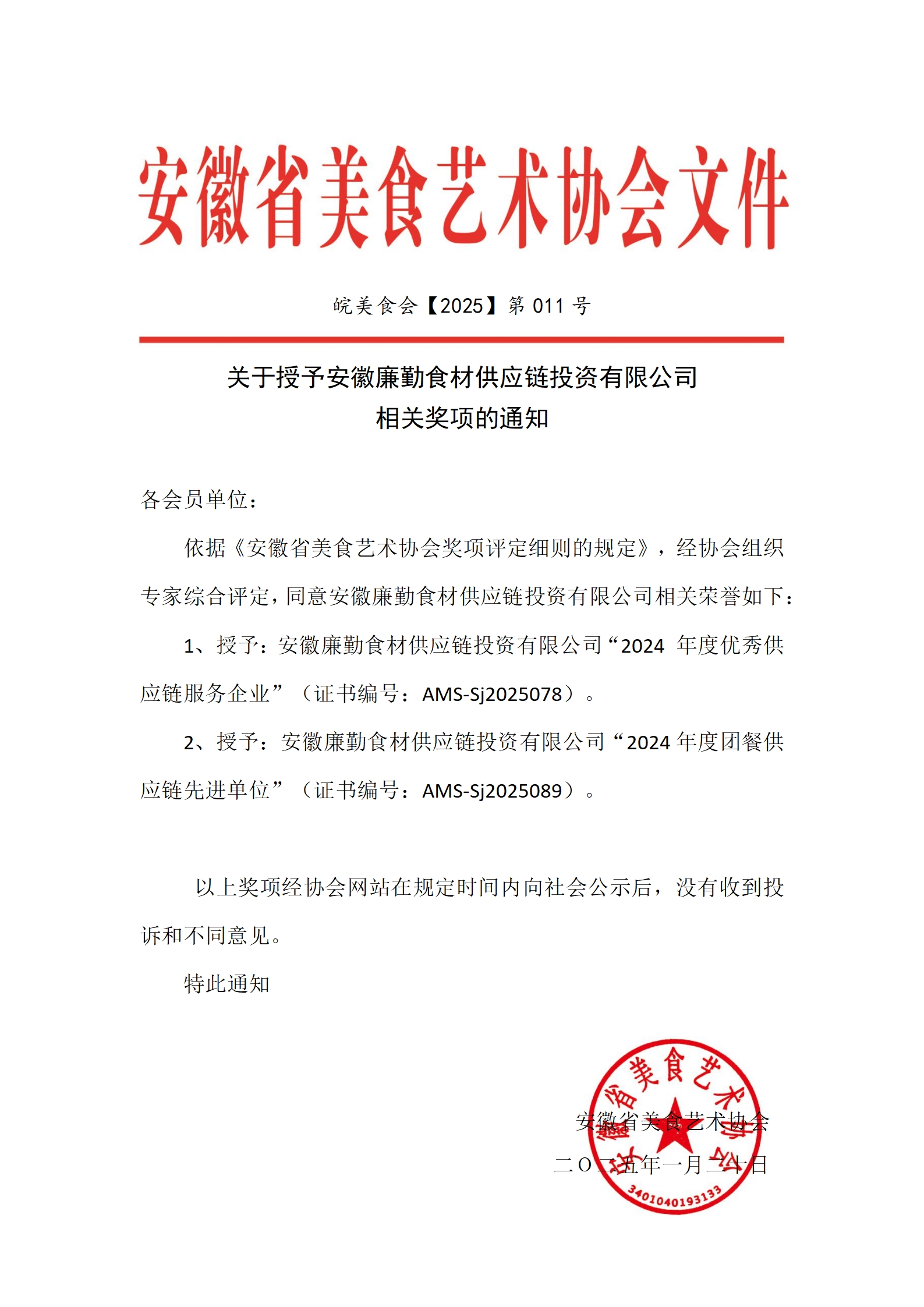 关于授予安徽廉勤食材供应链投资有限公司相关奖项的通知