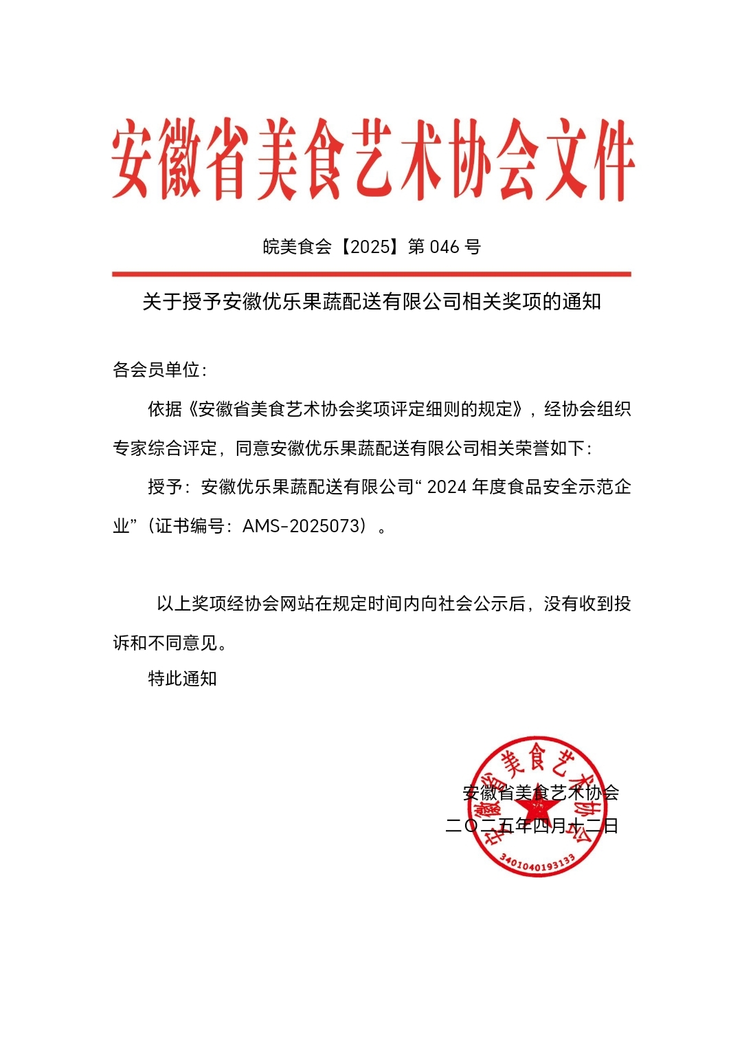 关于授予安徽优乐果蔬配送有限公司相关奖项的通知