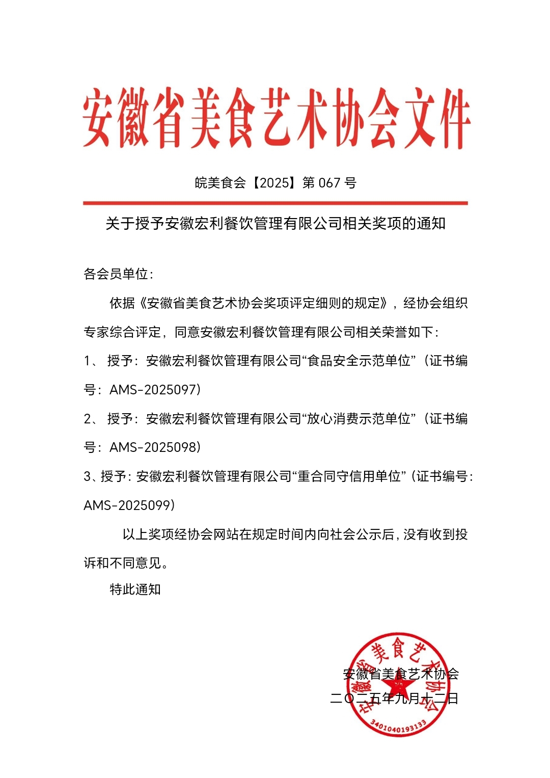 关于授予安徽宏利餐饮管理有限公司相关奖项的通知
