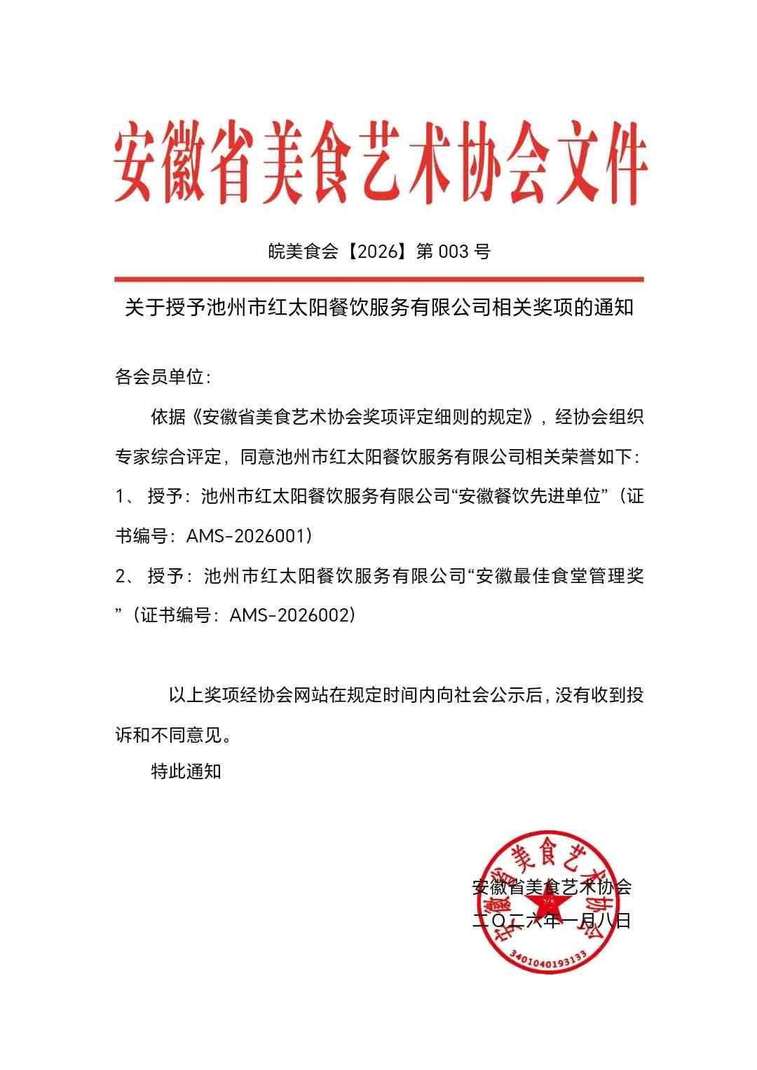 关于授予池州市红太阳餐饮服务有限公司相关奖项的通知
