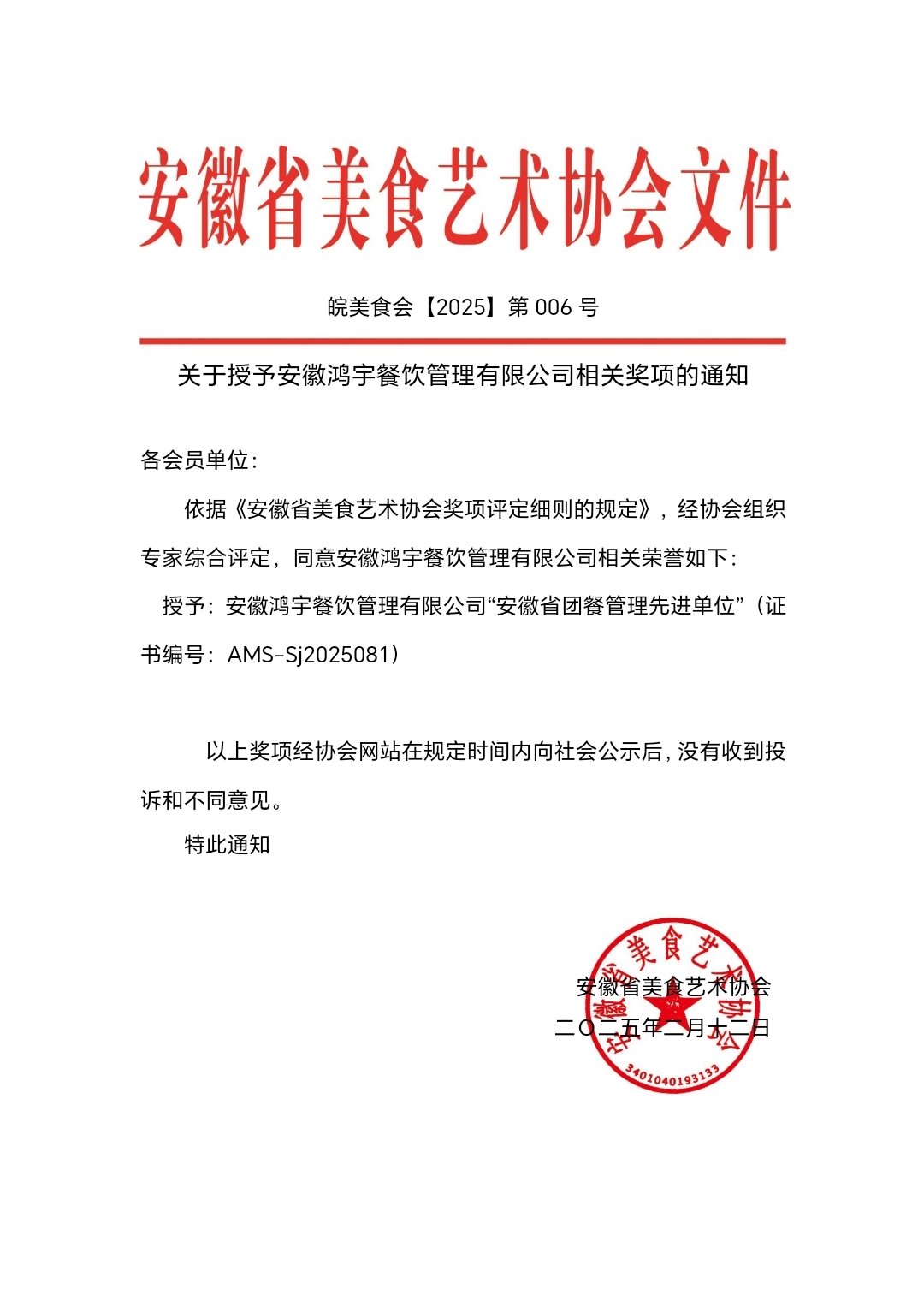 关于授予安徽鸿宇餐饮管理有限公司相关奖项的通知