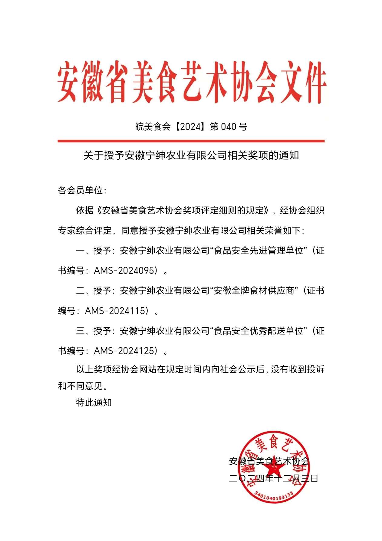 关于授予安徽宁绅农业有限公司相关奖项的通知